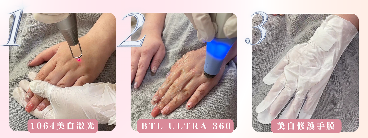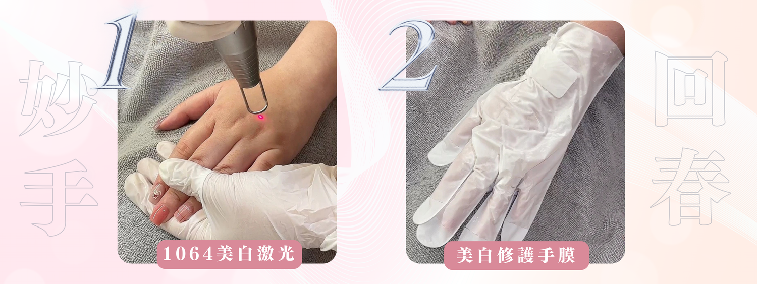 針對手部的色素色斑及膚色不均問題,以laser1064掃走色素並均勻膚色,同時做到美白效果。