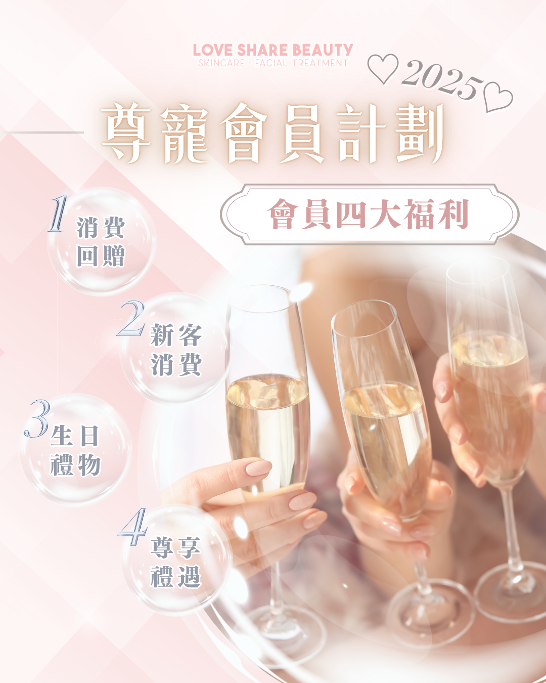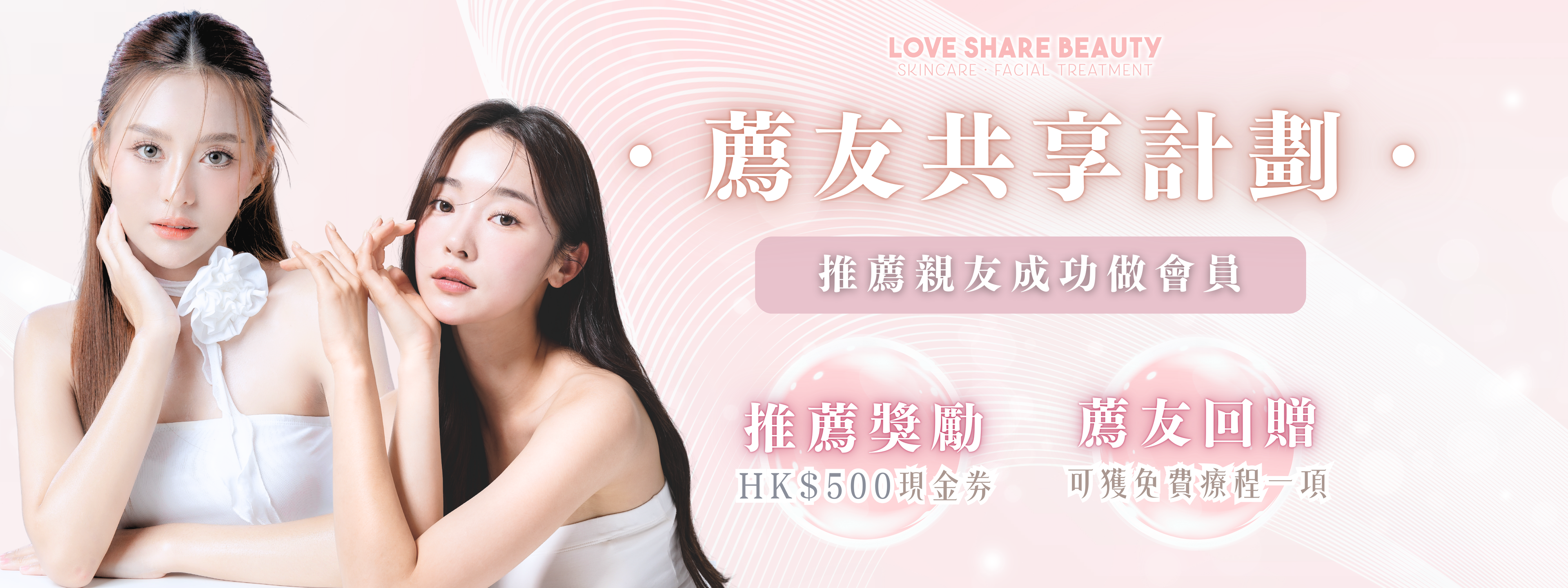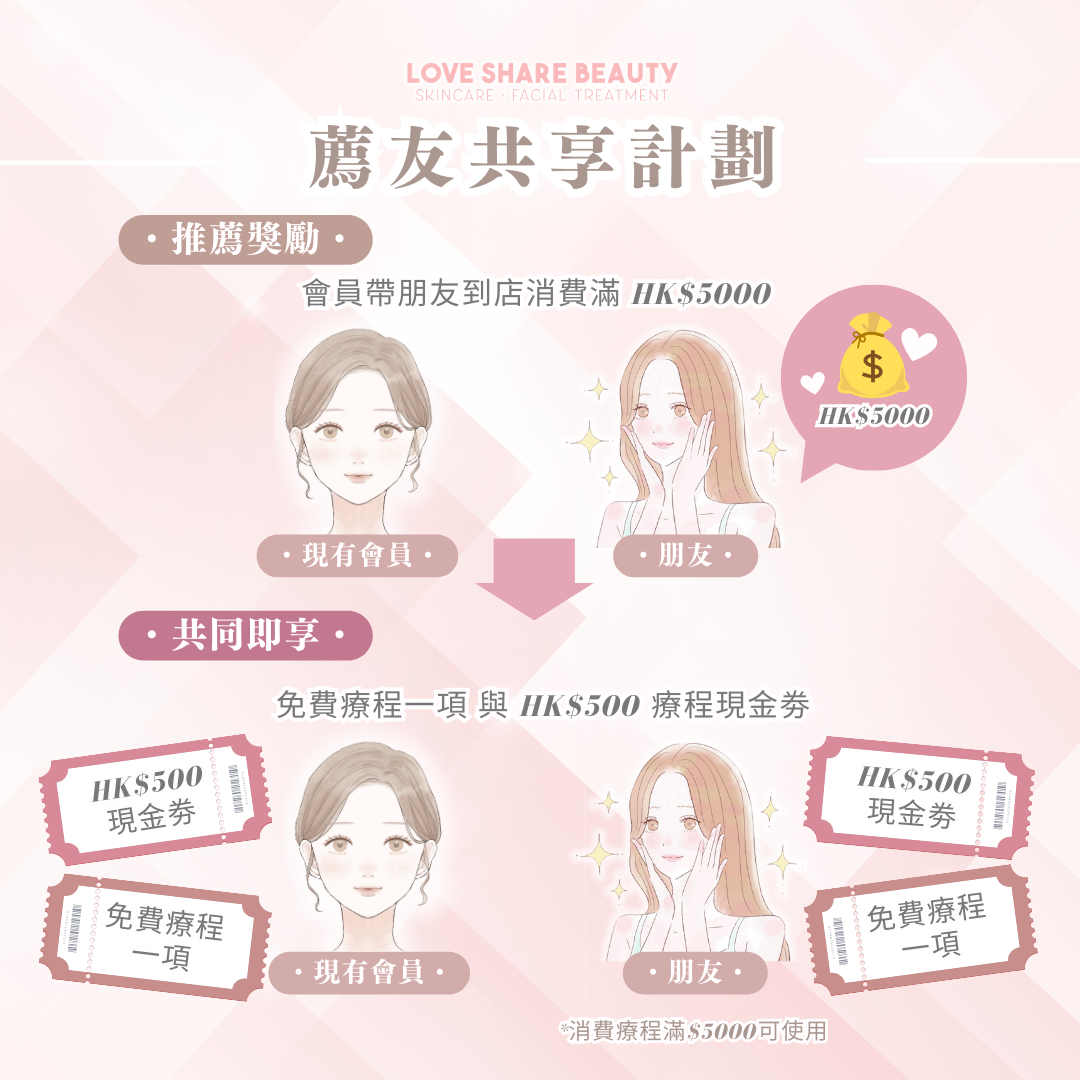 Love Share Beauty推出全新「薦友共享計劃」,現有客戶只要成功推薦親友成為新會員,即可享以下推薦獎勵1+2,另外推加會員額外薦友回贈,「薦」友越多,禮物越多,快點約同朋友一起做facial!