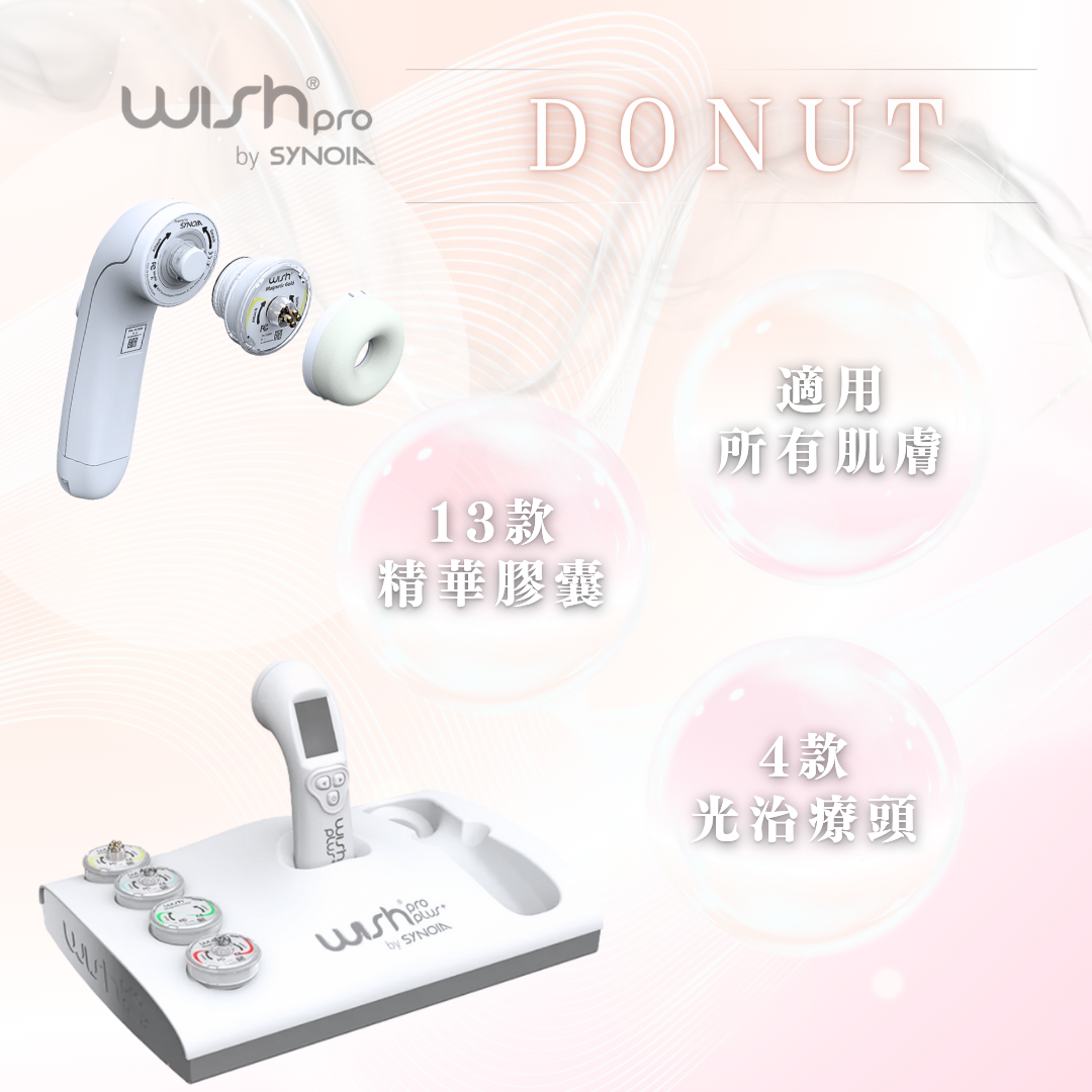 2. Donut: Wishpro Donut同樣榮獲美國FDA認證及多項專利認證,配有十多種不同功能的精華膠囊,切合不同肌膚需要,作為任何療程前的最佳「打底」準備! 無論配合任何高能量儀器都能夠將效果雙倍發揮,效果更持久。