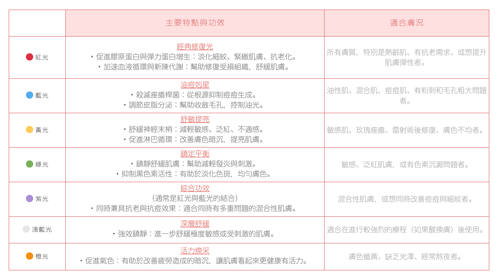 - 紅光: 刺激膠原蛋白及血液循環、減輕痛症